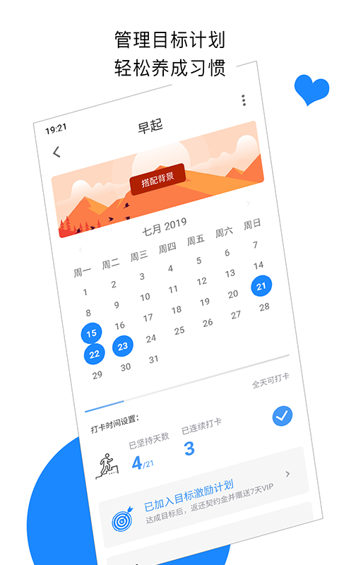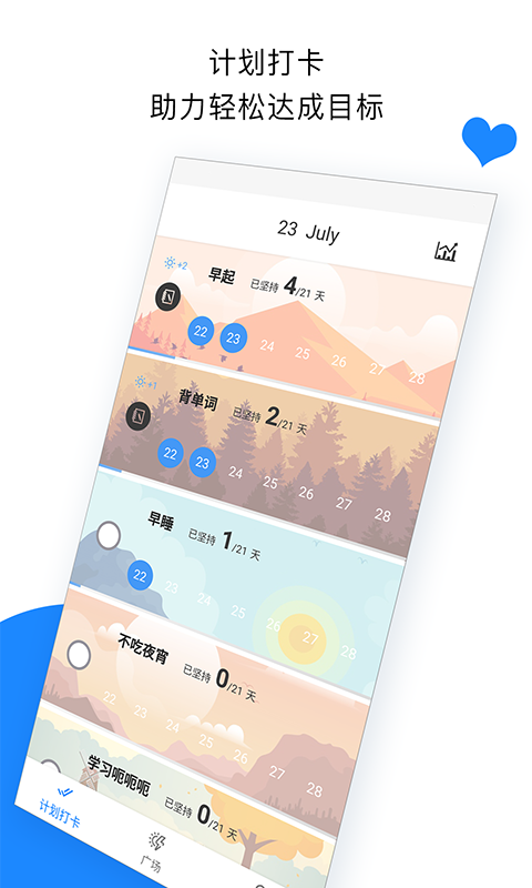 app是一款帮助你养成良好习惯的目标管理软件,用户在软件设立目标后,可以和小伙伴们一起打卡,互相监督,一起朝更好的自己迈步。