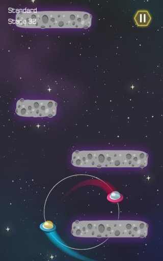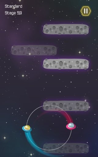 宇宙二人转(Duet Escape)是一款虐心的休闲游戏,小编都不知道是我在玩这游戏还是这游戏在玩我。这游戏太考验协调力和胆量了,尤其是横框的时候,一定要调整好,等到一个飞船过去了然后赶紧转。忙中出错真是太常见了,小编真是被虐的体无完肤,如果哪位能通关小编真是膜拜的五体投地。