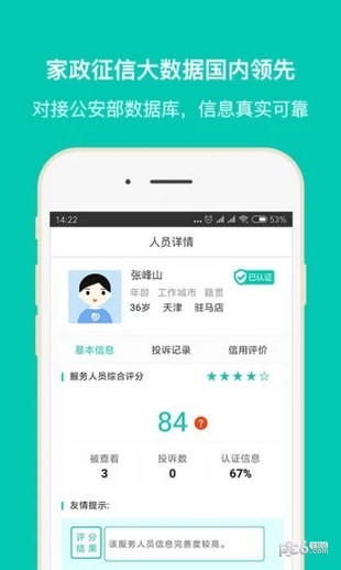 家政查是一款家政服务诚信记录查询及评价软件,是我们寻找“放心保姆”的专属工具。它将家政公司、家政人员和雇主放在一个开放的网络环境中,以“三方互评”功能将他们纳入家政诚信体系中。