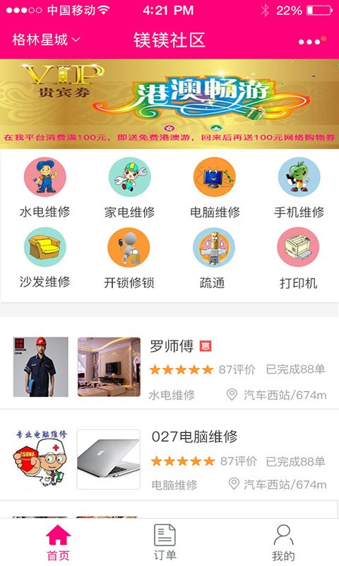 镁镁社区客户端基于定位主要实现了,用户可以在线下单,选择优惠的师父服务,方便地享受线下服务,