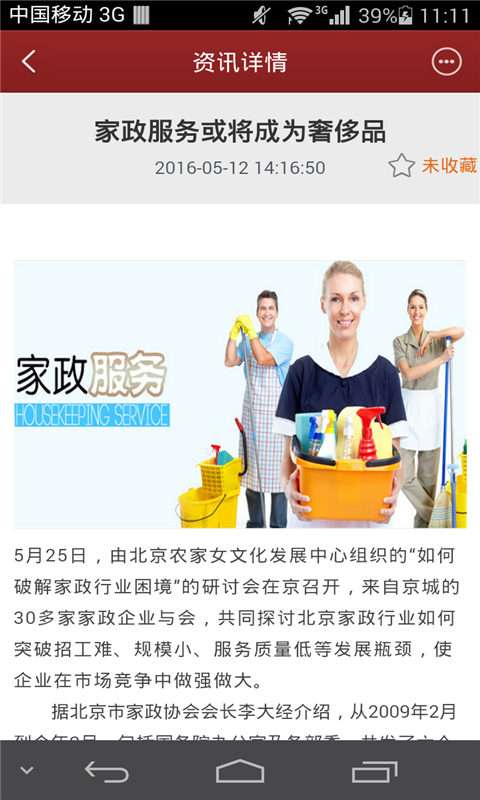 家政门户app是一款家政服务类应用软件,提供业务包括钟点工服务、蒸汽清洁服务、搬家服务、育婴服务等等,还能查看最新资讯,掌握更多家政知识。