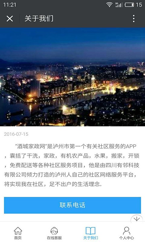 酒城家政网是泸州市第一个有关社区服务的APP,囊括了干洗,家政,有机农产品,水果,搬家,开锁,免费配送等各种社区服务项目,他是由四川有邻科技有限公司倾力打造的泸州人自己的社区网络服务平台,将实现我在社区,足不出户的生活理念。