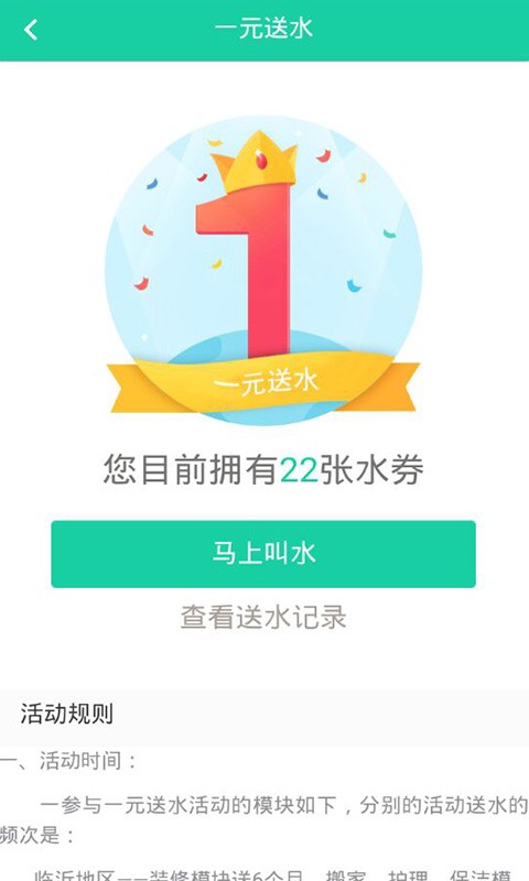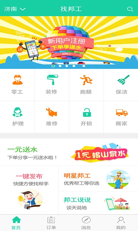 下单用户立即享受3到6个月的一元送水,炎炎夏日,为您送去清凉的甘甜山泉水生活好帮手,服务找邦工邦工是一款集零工、装修、搬家、护理等为一体的本地生活服务应用,我们的零用工,装修师傅,家政阿姨都是经过层层筛选,只雇佣最好的师傅、阿姨给您带给您满意的服务体验。100%资信认证,严格身份/健康/资历/诚信/验证筛选,身份录入切实保护你的利益与安全。带给您最好的服务体验。