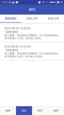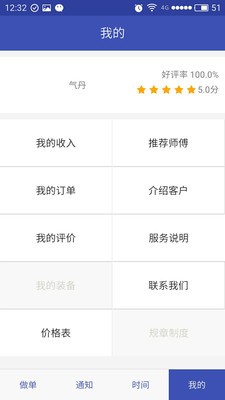 个人中心:服务人员可以实时查看个人收入,完成订单,订单评价等信息。