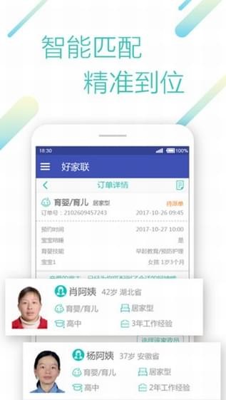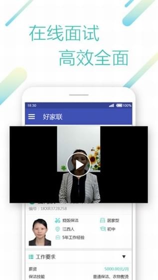 好家联是一款国内智能家政服务供需平台APP,好家联海量真实阿姨在线,身份验证,真实可靠。好家联预录“小视频”简历,足不出户,手机面试,一键换人,定期评价,后续服务无缝对接。