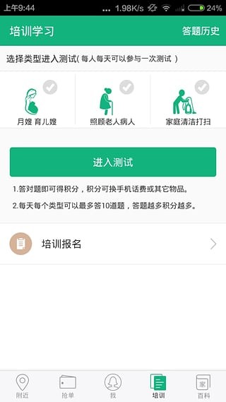 4、爱培训:特有的家政培训功能,可以实现在线测试、在线报名培训等服务。