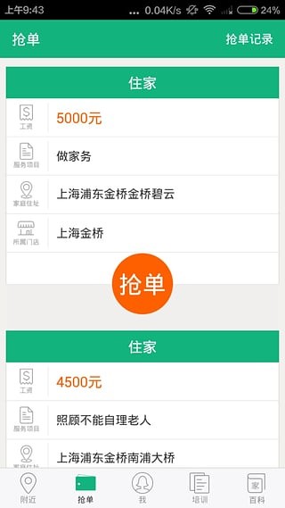 1、抢工作:支持阿姨们在线抢单,筛选适合工作。