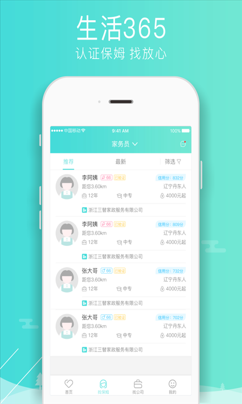 生活365是一家致力于保姆基本信息查看,保姆信用分查看,保姆在线预约的公司。联合各保姆公司,力求为客户提供有保障、可查看历史评价、个人技能等的优质保姆。