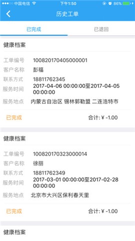 用于展示当前服务人员接受的服务工单,开始服务或者退回服务。还可以查看服务人员已完成的历史工单以及工单详情。