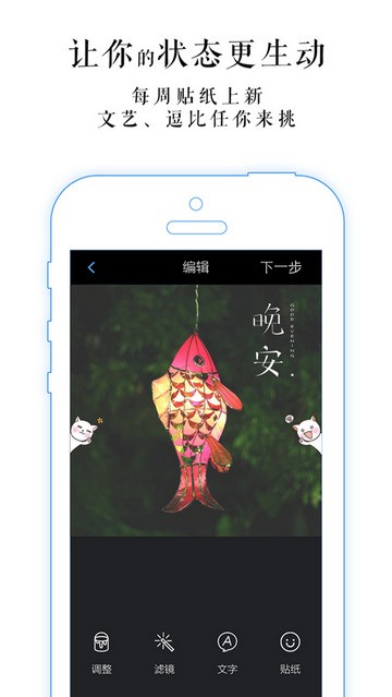 拍下一张照片,发表你的状态;给对方的照片拼一半你的照片,就等于对ta打了个招呼。