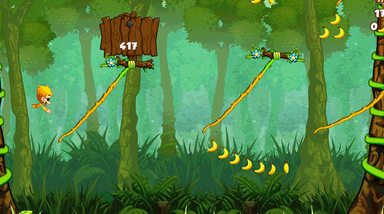 开始后游戏后猴子就会向前飞奔,掌握时机跳跃猴子将会攀上藤蔓向前荡,之后也就没有退路和停止了,需要不断跳跃到下一根藤蔓上,同时尽量多吃到路上的香蕉,在热带丛林里疯狂飙行吧!