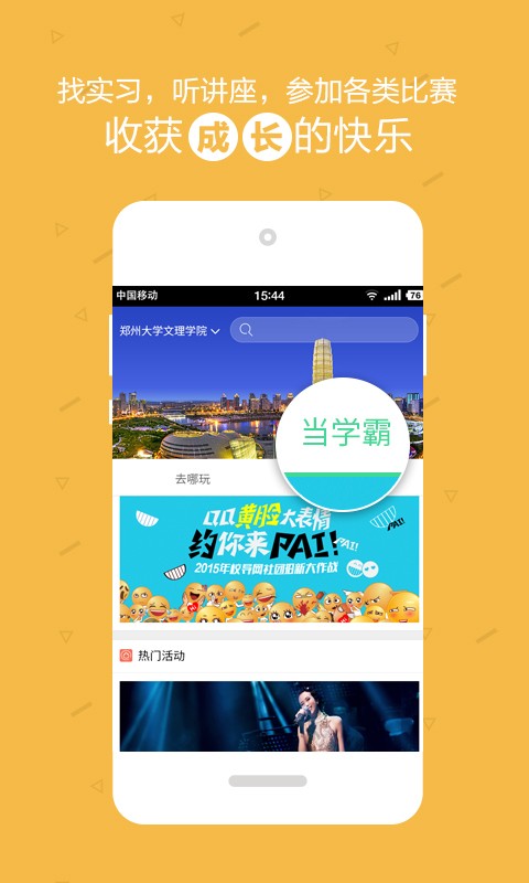 软件特色发现活动:发现校园的、同城的活动。无论你想找好玩的活动跟朋友一起high,还是找实习实践提升自己,这里都能满足你