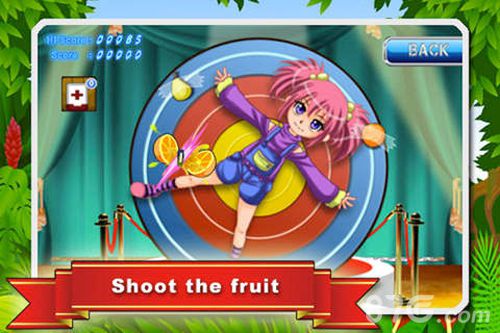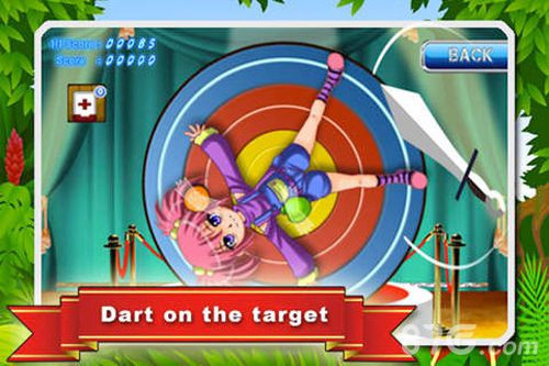 水果飞刀是一款APP继《水果忍者》之后又一热门的切水果游戏,水果飞刀与之前的切水果游戏不同的是,玩家在这里不但可以切水果还可以用飞刀射水果。看过杂技表演的玩家应该都是知道飞镖杂技,游戏也将这一杂技融入其中,游戏为玩家提供了一个有人绑在上面的靶子,并在人的四肢旁边放有水果,玩家需要将飞镖命中水果,若是稍有不慎射中人,那么她就毁在你手上了。