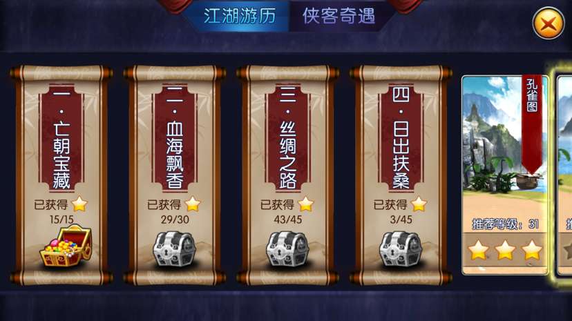第一天大家就会接触到江湖游历(普通)副本和侠客奇遇(精英)副本,与大家的游戏习惯相同,普通副本主要产出培养所需的材料,而精英副本主要产出侠客的碎片。