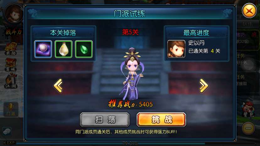 玩法中门派试炼可以产出绝杀的升阶道具和宝石,培养战力可是不容错过的哟!另外,门派技能也是重要的战力组成部分,一不留神遗漏了…可别怪小编没有提醒你哦!