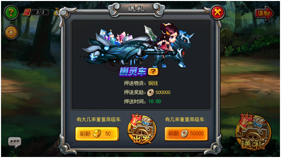 迎亲聘礼在42级会为友友们开启,礼车包括槽车,战车,金帛车和幽灵车四种,可以通过元宝或者铜币刷新车的品质和押送的物品。