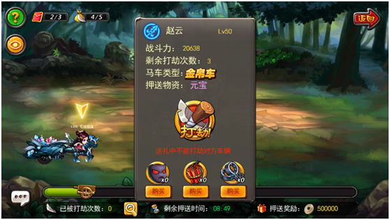 点击礼车可以打劫,也可以用元宝购买辅助道具来提高打劫的成功率。打劫成功可以获得对方礼车上的一部分物资。每辆车被打劫的次数有上限。