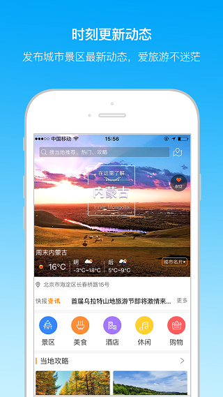 周末内蒙古app是一款由导览天下荣誉出品的旅游出行应用,整合景区周边资源,为用户提供吃喝玩乐等服务,帮助游客轻松玩转景区,拥有更愉悦的旅游体验。