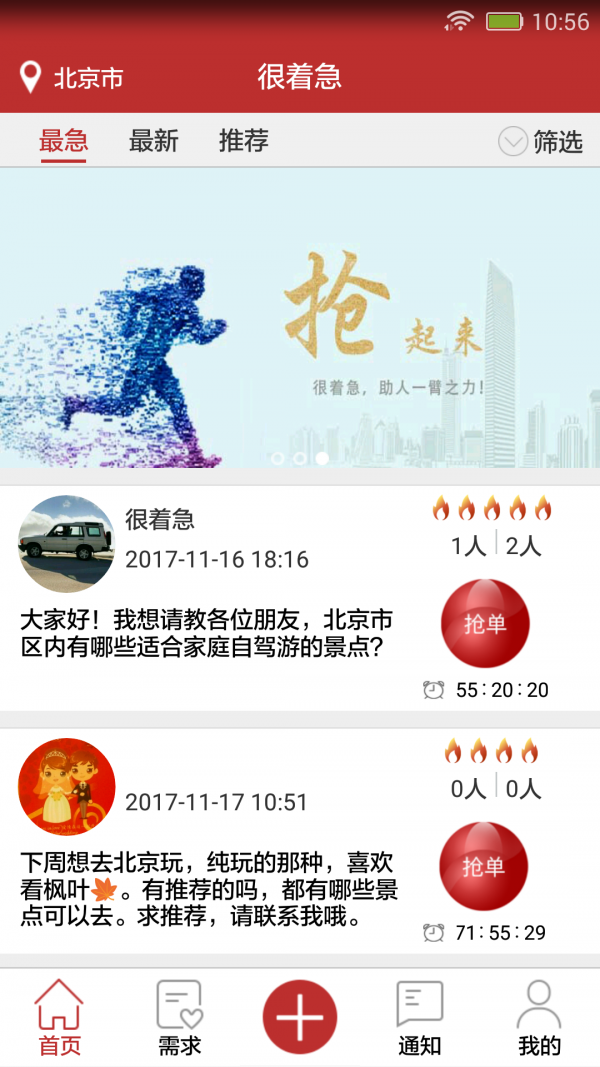 2、“很着急”APP为用户提供着急程度的选择,当用户越着急,他们的需求在信息流中的排列越靠前,从而帮助他们尽快地寻得帮助。