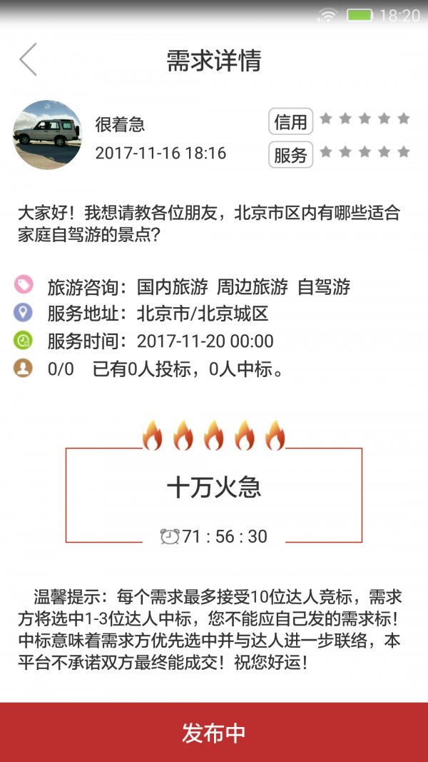“很着急”APP是一款为解决人们旅游相关问题而生的在线咨询平台。用户可以在“很着急”APP上发布旅游相关的咨询或者发布请求他人协助的需求,其他用户可以参与这个需求的应征,当需求发布者选中某个应征者时,本平台将为双方交换联系方式以便他们进一步联系。