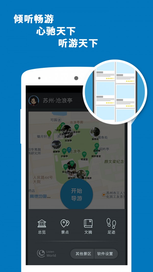 听游天下——沧浪亭导游:专业的智能语音导游系统,专为喜欢自由行的旅行爱好者而设计。携手科大讯飞,带给您独特的沧浪亭印象。