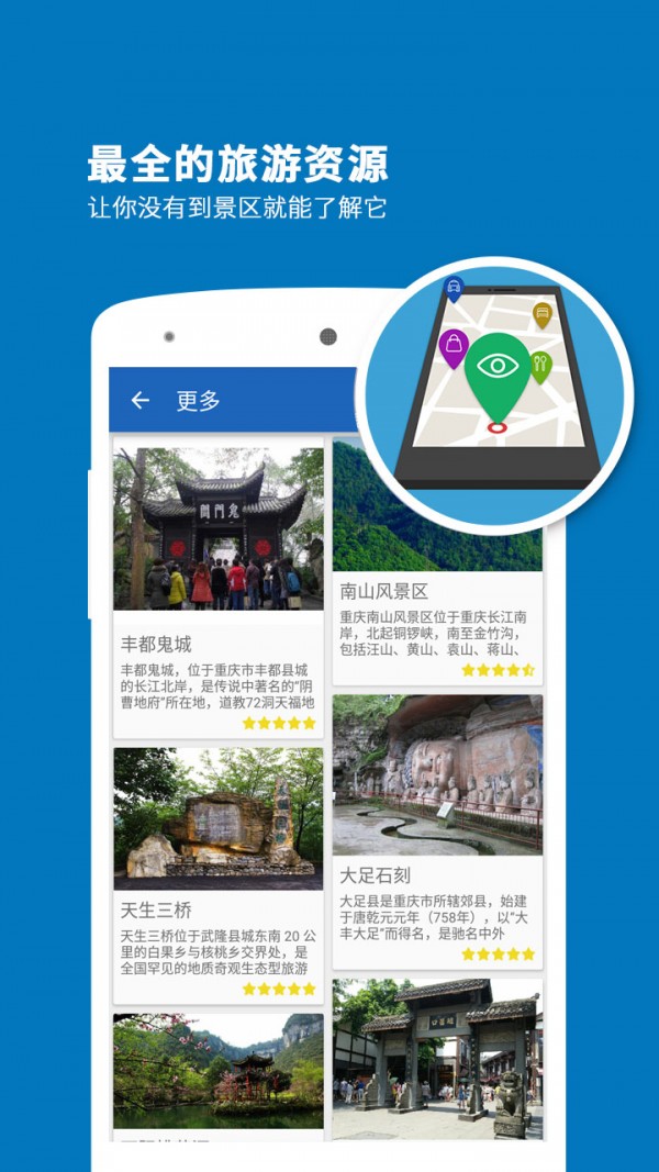 重庆导游app是一款为准备去重庆旅游的朋友准备的旅游出行软件,这里有全面的旅游资源信息,以及一站式旅游服务,让你的重庆之旅更加轻松,自在!