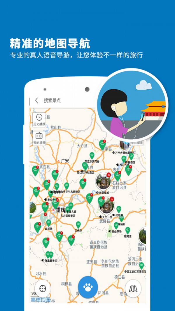 导游-步行和行车导游双模式随您选择,通过GPS定位为您精准播报每个景点的历史文化和内涵