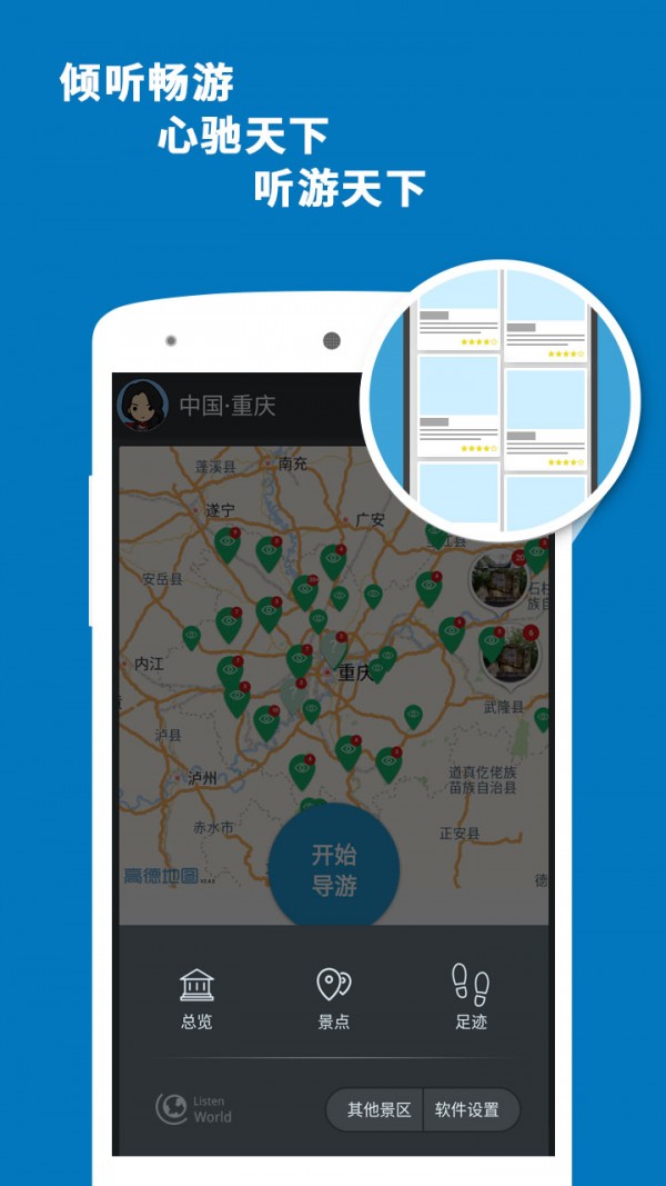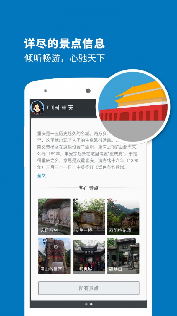 听游天下——重庆导游:专业的智能语音导游系统,专为喜欢自由行的旅行爱好者而设计。携手科大讯飞,带给您独特的重庆印象。