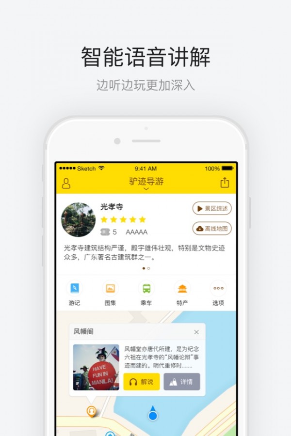语音导游:专业主播录制的景点讲解及到点播报,多语种支持,走到哪儿听到哪儿。