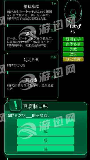 这是一个有关人生的游戏,玩家可以创建自己的角色,在这个逗比的社会中经历一生。死后还可以将自己的坟墓与朋友分享。游戏内事件会根据角色的选择发生改变,一些事件也会随机发生。事件全靠玩家贡献,你也可以将你的想法,提交给作者,写进游戏中。