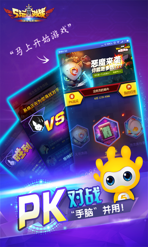 5玩对战是一款竞技场手游,五玩游戏,挑战前所未有!海量HTML5游戏,点开即玩!搭载HTML5游戏加速引擎,顺畅运行h5游戏,带来全新HTML5游戏体验。5玩对战娱乐社交两不误,我在五玩游戏等你来对战!