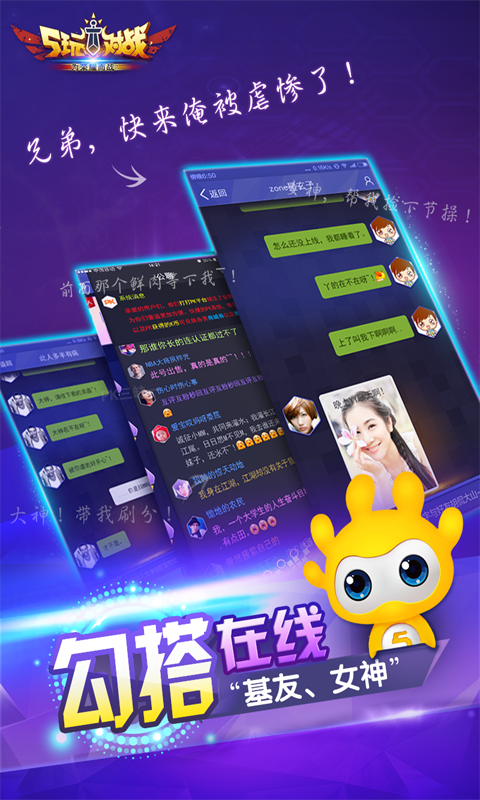 【游戏社交,相约女神】5玩对战汇集众多小鲜肉和萌妹纸,男神女神PK对战,私聊公聊送礼物,赢取对方的芳心,让玩游戏不再孤单,让社交不再无聊。