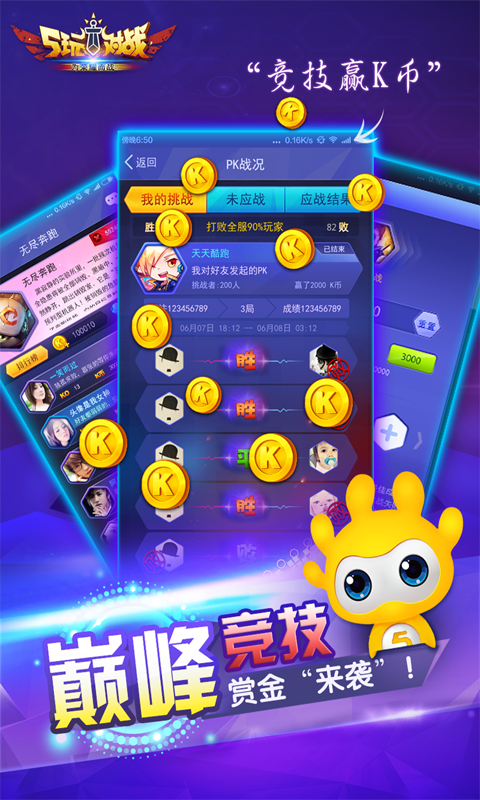 《5玩对战》本身则实现了移动端领域游戏对战平台这项巨大突破及创新,它利用Html5基础的交互性做到了移动端app无法做到的手游竞技社交模式,而不是循规蹈矩的将所有Html5游戏一股脑的丢在玩家面前。实现了移动端对战的巨大突破。使IOS用户和安卓用户统统可以在《5玩对战》上互相邀请好友进行PK挑战,这一破冰之举终于让所有手游玩家迎来了大团圆。在《5玩对战》里,Android和IOS玩家可以同时选择游戏向好友或全部玩家发起PK,赢取K币,兑换奖品,通过游戏内置的IM聊天系统达成社交。5玩在手机里为玩家创造了一个竞技场,让玩家充分享受和好友对战、比拼从而获取胜利的快感。同时5玩的平台上拥有众多自研发的优质Html5游戏,可以带来不重复的游戏体验,极大的提高了用户留存和黏性。