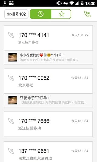 4、App中的店铺号来电记录,若是成交买家的来电,均带订单信息,便于查看。