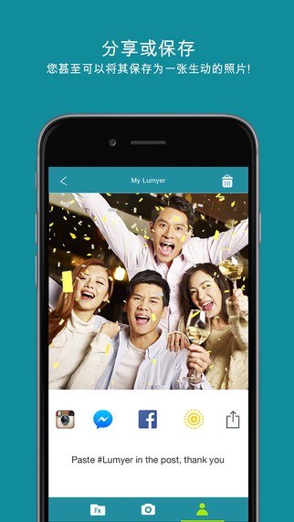 4、Lumyer支持分享到Facebook,instagram,Messenger,WhatsApp。甚至,Lumyer制作的动态度还能分享给微信好友。
