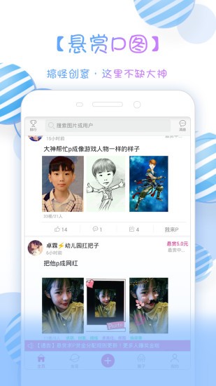 想修图?想换背景?想恶搞?想创意?不会P图?没关系,发个悬赏令,当一回皇上,百万P图大神帮你实现愿望,秒杀各种黄油美颜美妆相机工具效果。更重要的是还有红包抢哟。