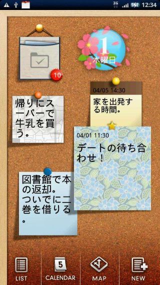 来自鼎鼎大名的日本运营商NTT DOCOMO,功能十分强大,操作绝对方便,界面会非常卡哇伊,除了便签功能,还有日历,另外最大的特色是加入了LBS元素,就是基于手机位置提供了一些使用场景。具体功能:- 在主题板上随意新建和编辑彩色便签及日历(点击可进入编辑状态,长按可mail或者删除此便签)- 根据地点和时间进行提醒(内置地图功能)- 将便签通过邮件分享给朋友- 根据地点可以改变Wi-Fi的开关状态- 可在桌面添加widget- 通过摄像头查看目标地点