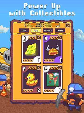 设置之后会帮助开挖地层,也会在挖掘过程中。如果有閒钱,也可以用来升级各种装置来强化开挖的能力。有时候挖开地层的时候会拿到神器(卡片),这些神器就是装备,可以点右上角的artifacts进行装备、升级与合成。
