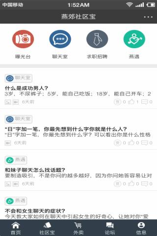 为社区民居提供求新闻资讯、招聘、二手交易、房屋出租、社区外卖等信息。燕郊社区小伙伴们快来下载体验燕郊专属APP吧!!!