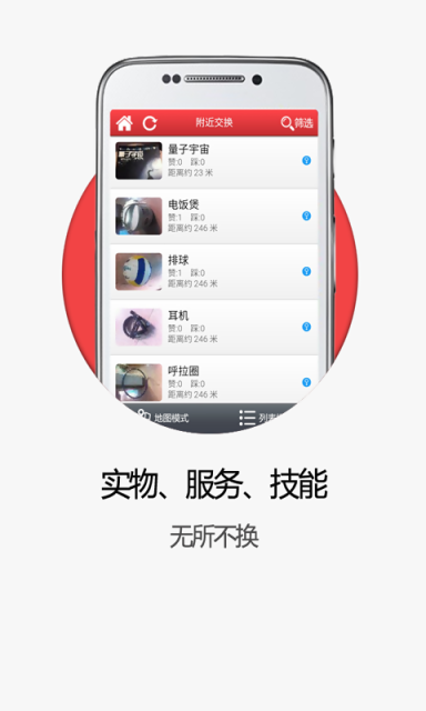 附近交换是一款基于地理位置的全能交换平台App(包括物对物,物对服务,服务对服务),用户打开App即可全向搜索周围的交换物品与服务,同时用户也可发布自己的交换信息,功能操作简单快捷,方便实惠。