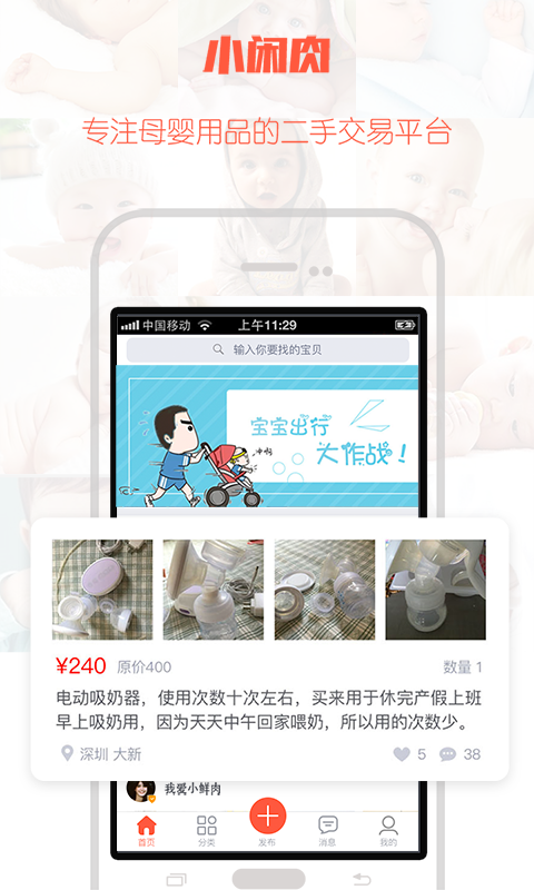小闲肉app是一款生活服务应用,是是深圳市森巴互动科技有限公司旗下的母婴闲置物品和母婴二手物品交易平台。小闲肉app,致力于母婴闲置用品放心买,放心卖。