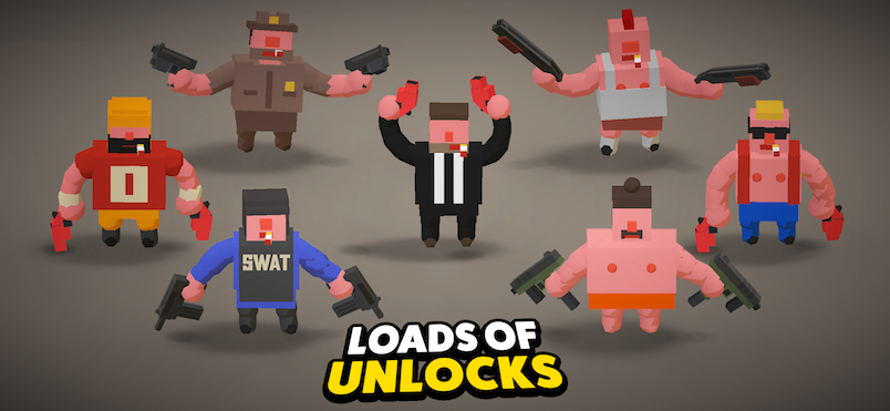 《Agent Wonky》玩法十分简单,玩家只需触摸滑动屏幕就操控黑衣人角色进行疯狂扫射,游戏的画风独特,沙盒风格的人物设计让游戏显得生动有趣,有一种在MC世界战斗的既视感。