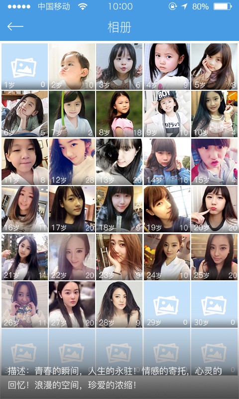 我的影集中包含了成长相册和普通相册,您可以为自己或家人随意创建属于他们的相册并记录下每个年龄阶段所留下的照片。