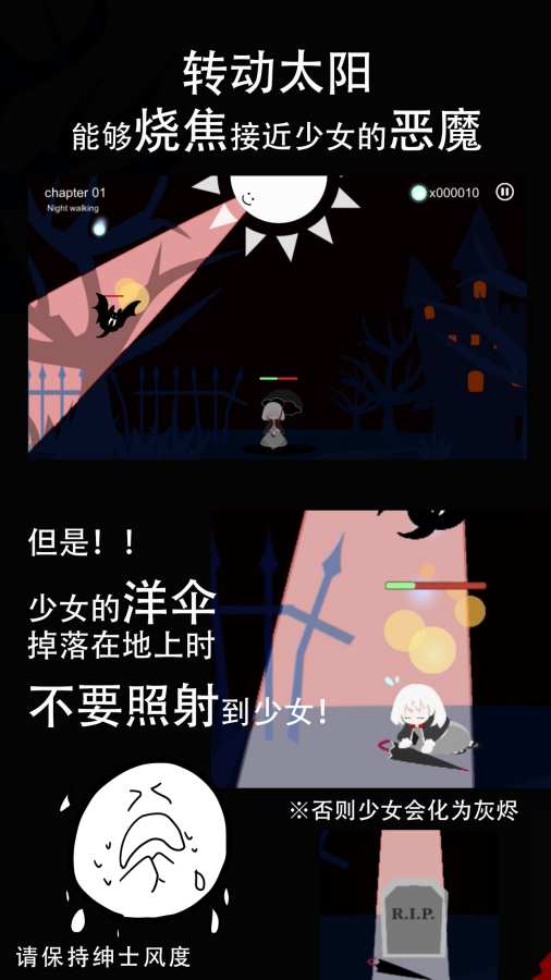 ・当女孩子接触到敌人时,她的洋伞会掉到地上,此时一定不要过长时间照射女孩,否则女孩会化为灰烬。