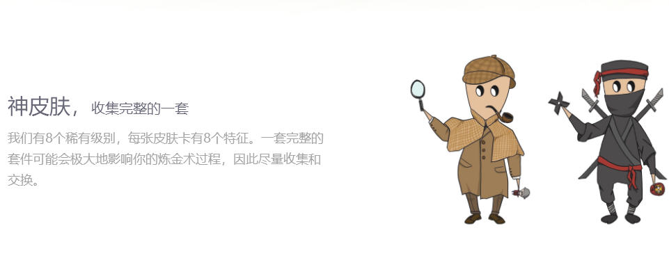我们有8个级别的稀有性,每个皮肤卡有8个特点。一个完整的集合可以极大地影响你的炼金术过程,所以试着收集和交换。