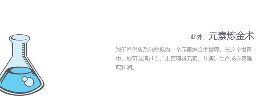 我们模拟了一个供应系统作为元素的炼金术世界,在其中你可以产生新的元素的聚集和生产或交易获利。