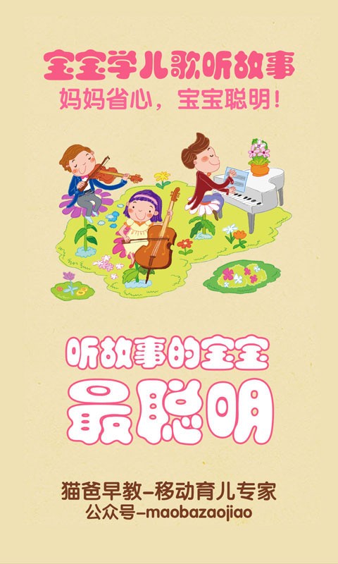 《宝宝学儿歌听故事app》包含儿歌,儿童睡前故事,儿童歌曲大全.胎教音乐,寓言故事,民间故事,唐诗,成语故事,童谣,通话。