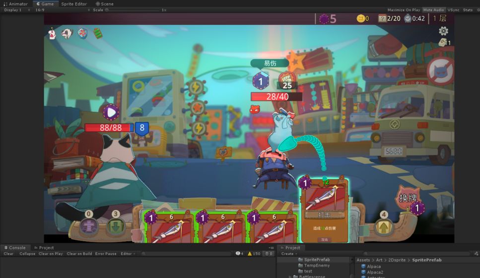 1、手绘式画风的2D画面,收集卡牌,进行构筑,参与各式战斗。