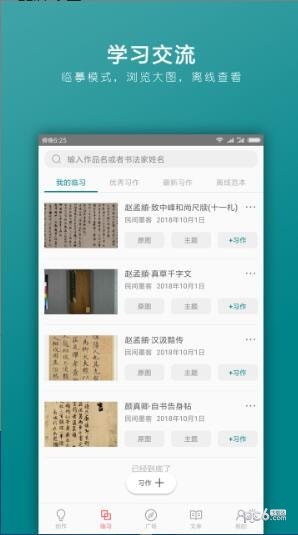 从千幅碑帖范本中,挑出你喜欢的加入临习,进入临摹模式后,可以浏览大图,可以离线查看,欣赏精彩细节,尽情的模仿学习。记得上传你的习作,你也可以方便的浏览到选择了相同碑帖的书友作品,你们可以互相点评,互相鼓励,当然也会有热心肠的民间高手会给你指点迷津,这不是也挺快乐的事情吗。