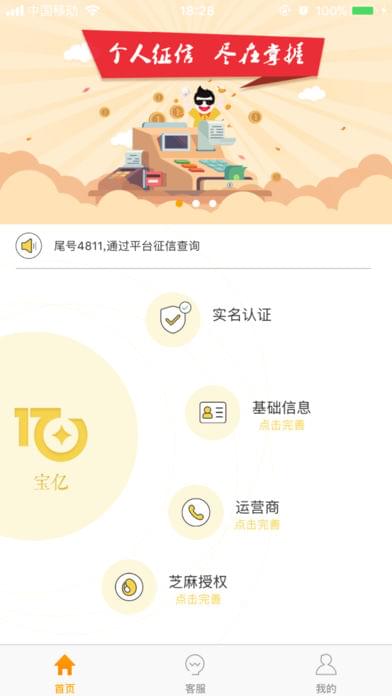 宝亿app在对用户进行实名认证,运营商认证,芝麻信用认证的过程中对用户的征信做一个评估,让用户很直观地了解自己的征信情况。方便用户随时查看自己的征信情况。